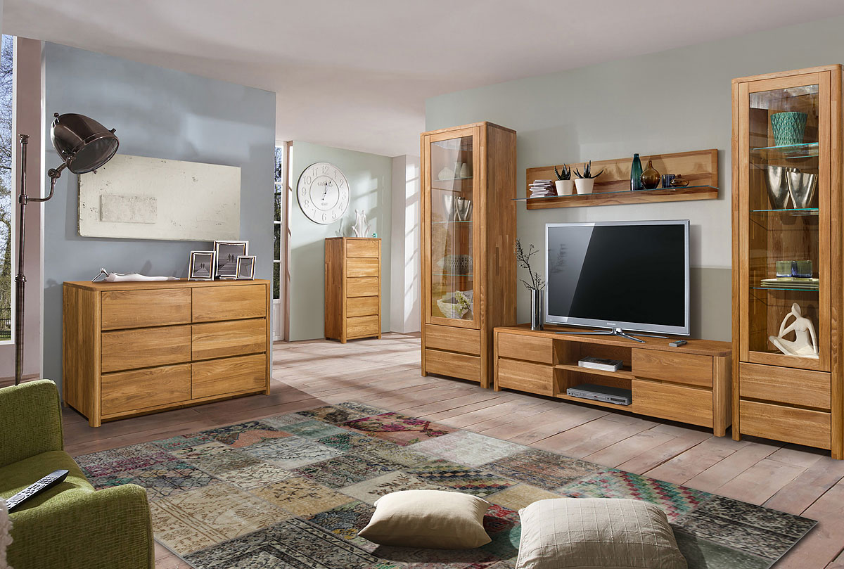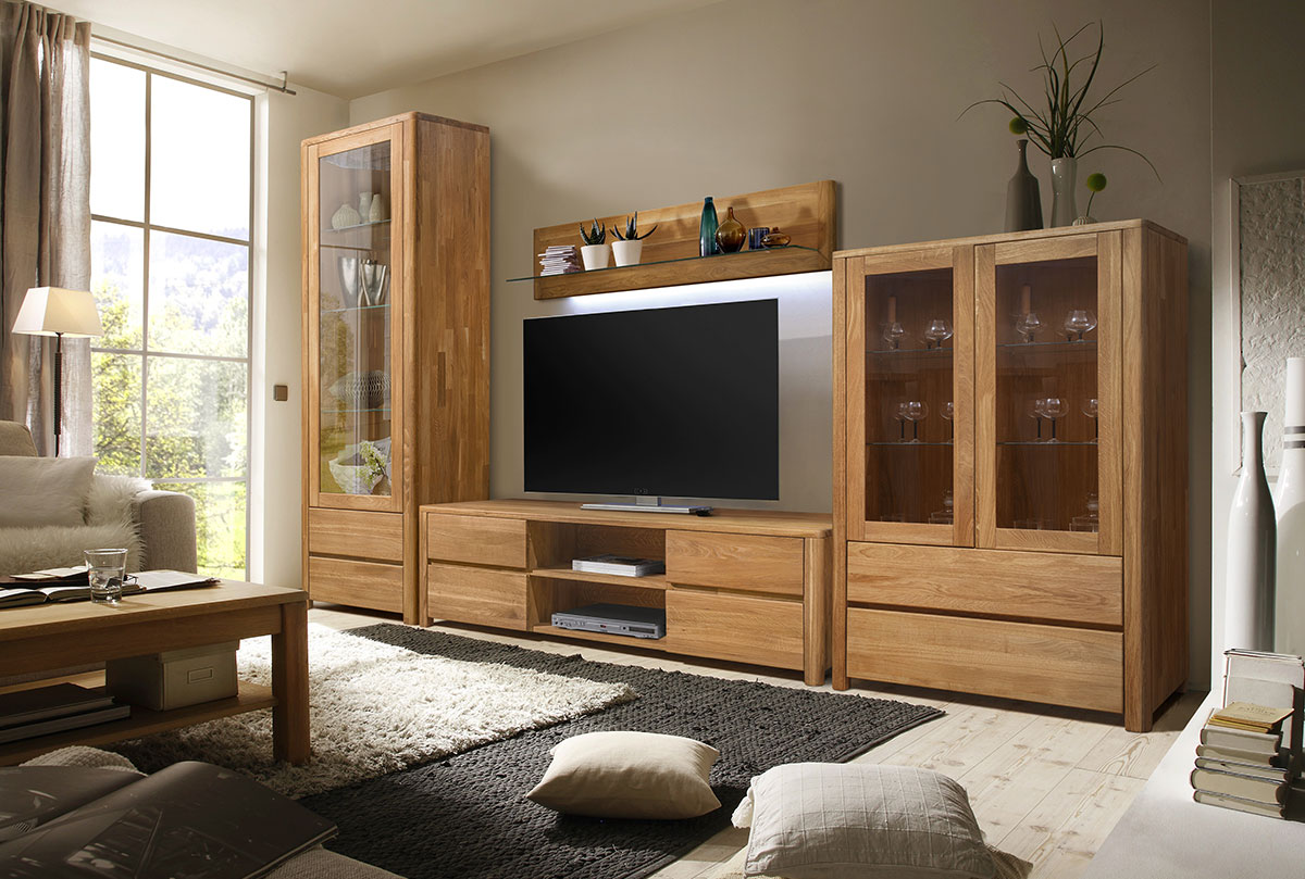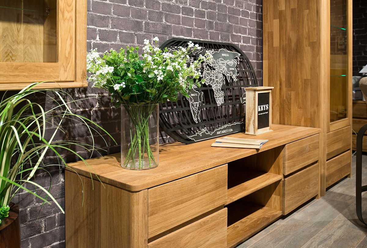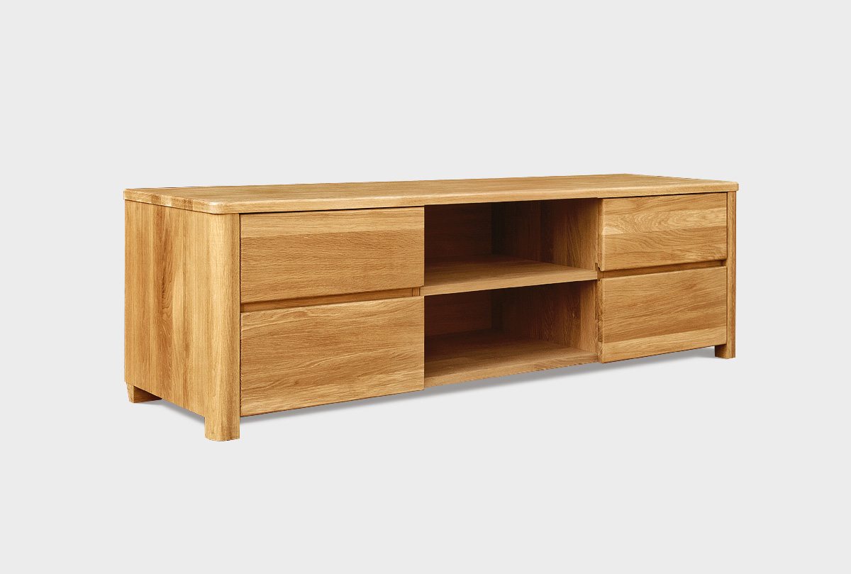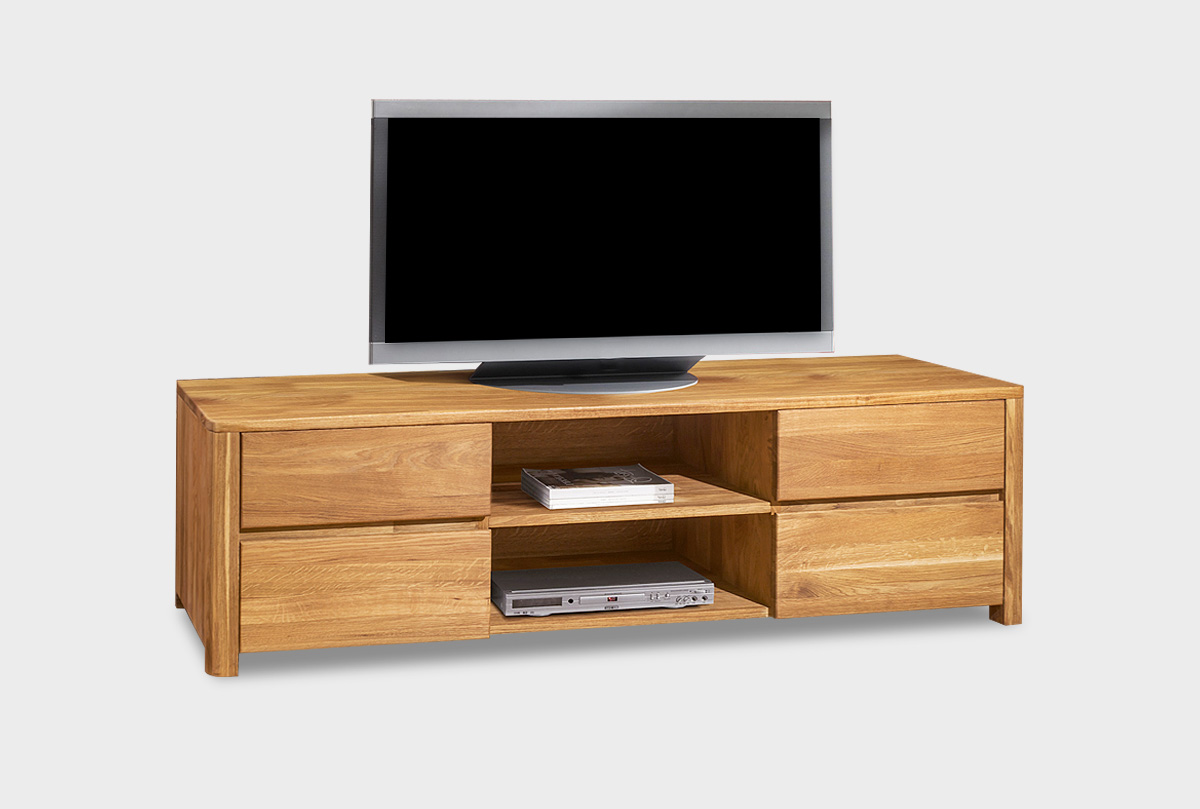 Тумба под ТВ «Норд» в цвете «бейц-масло» - это сочетание простоты, элегантности и лаконичности. Покрытие бейц-маслом подчеркивает природную красоту массива дуба: это делает тумбу универсальным предметом мебели и позволяет Вам сочетать ее с мебелью практически в любом стиле. Оптимальная высота тумбы позволит смотреть телевизор с комфортом, не напрягая глаза. Благодаря функциональному наполнению она может служить и как дополнительное место для хранения: четыре выдвижных ящика вместят нужные мелочи, а две ниши – аудио и видео технику.
