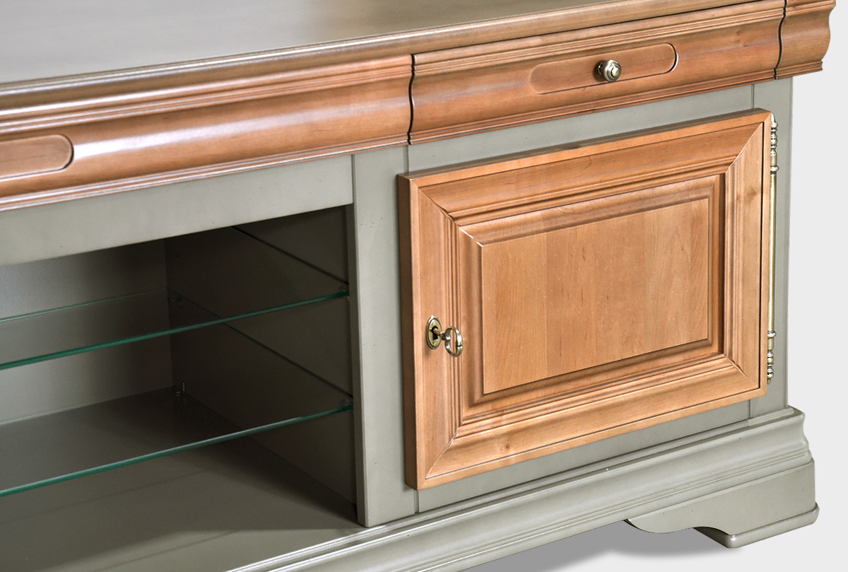 Выполненная из массива и шпона ольхи несравненная тумба под ТВ «Оливия» с нишей в цвете «олива» прекрасно впишется в гостиную как загородного дома, так и любой квартиры. Она элегантна и изысканна. Ее ширина позволяет разместить самые современные телевизоры, а на стеклянных полках можно удобно расположить всю аппаратуру. Более того ТВ тумба обладает тремя выдвижными ящиками, деликатно вписанными в столешницу и двумя нишами за закрытыми дверьми.