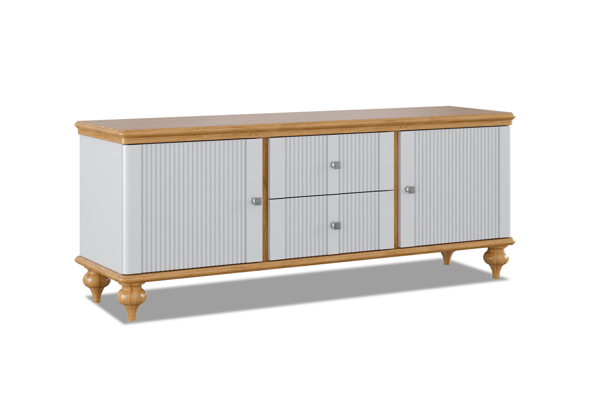 Трехсекционная тумба под ТВ «Рандеву» 22 в цвете «белый лак+антик 24». Размеры (ШxВxГ) 1465 x 575 x 411 мм. Тумба ТВ оснащена двумя выдвижными ящиками и двумя полками за распашными дверями. Фурнитура на ящиках и дверях с доводчиками. Высокие ножки обеспечивают оптимальный доступ при уборке.
