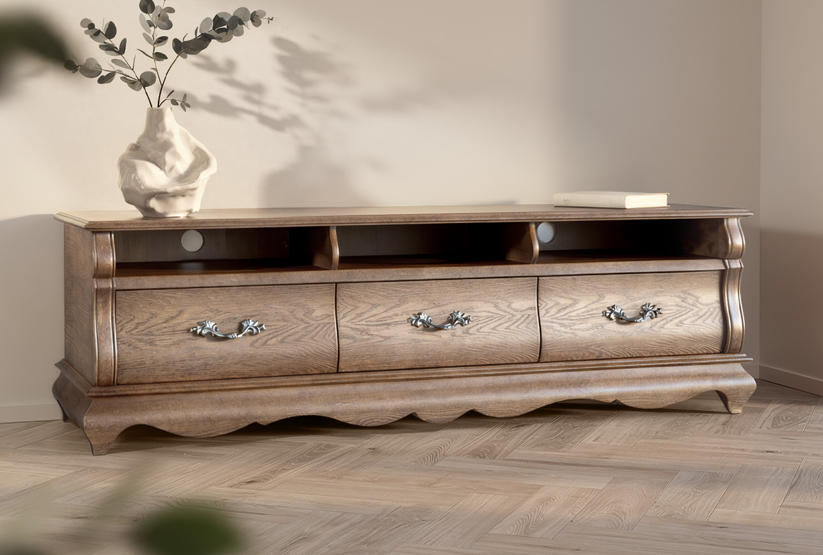 Утонченная тумба под ТВ «Тэфи» в цвете «амбэр с белой патиной» идеально дополнит интерьер современной гостиной либо столовой. Мебель, выдержанная в современном классическом стиле, характеризуется плавными линиями и продуманностью каждой детали. В схожих с классическими формах прослеживается мягкость и гармония. Изделие выполнено из массива дуба, поэтому помимо красивой текстуры отличается повышенной прочностью. Дно выдвижных ящиков отделано велюром.