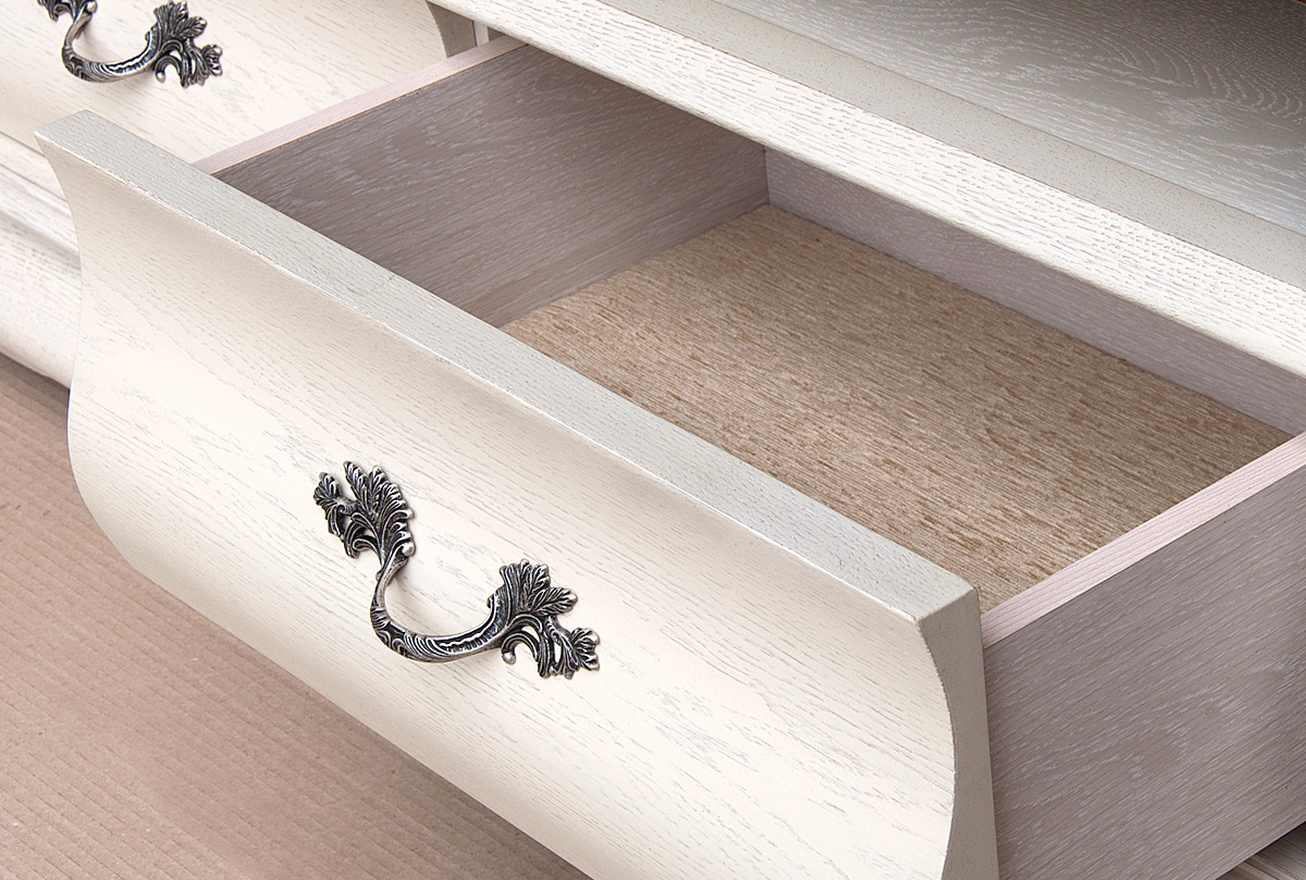 Утонченная тумба под ТВ из коллекции «Тэфи» идеально дополнит интерьер современной гостиной либо столовой. Мебель, выдержанная в современном классическом стиле, характеризуется плавными линиями и продуманностью каждой детали. В схожих с классическими формах прослеживается мягкость и гармония. Изделие выполнено из массива дуба, поэтому помимо красивой текстуры отличается повышенной прочностью. В коллекции представлены тумбы цвета «белая эмаль с темной патиной», «амбэр с белой патиной» и «классик». Дно выдвижных ящиков отделано велюром.