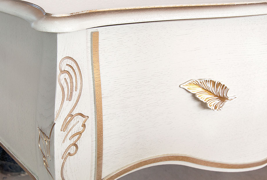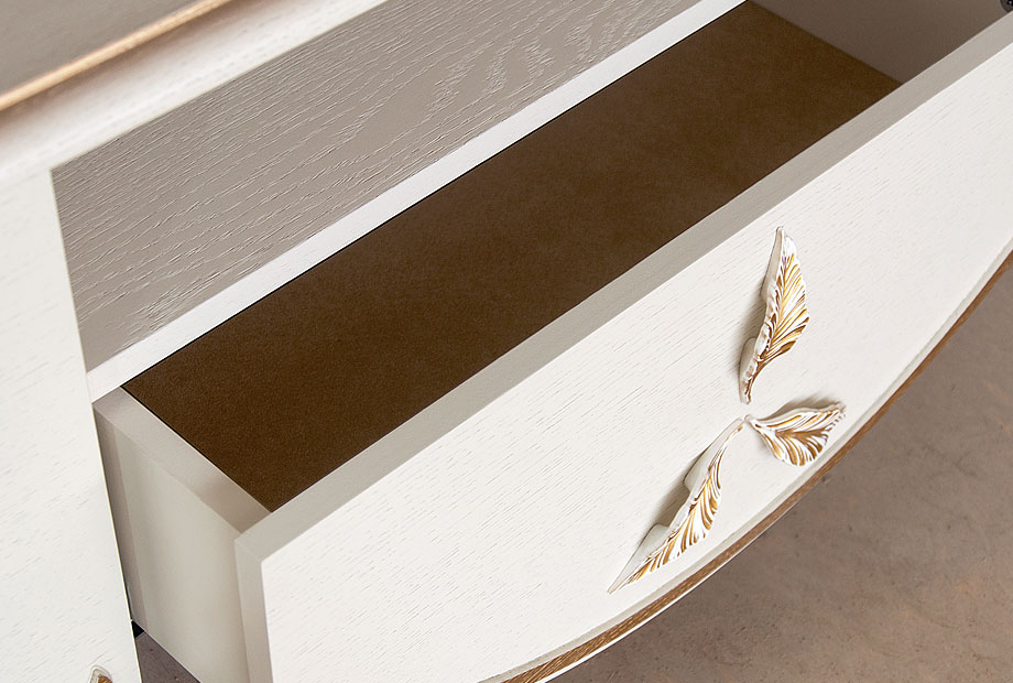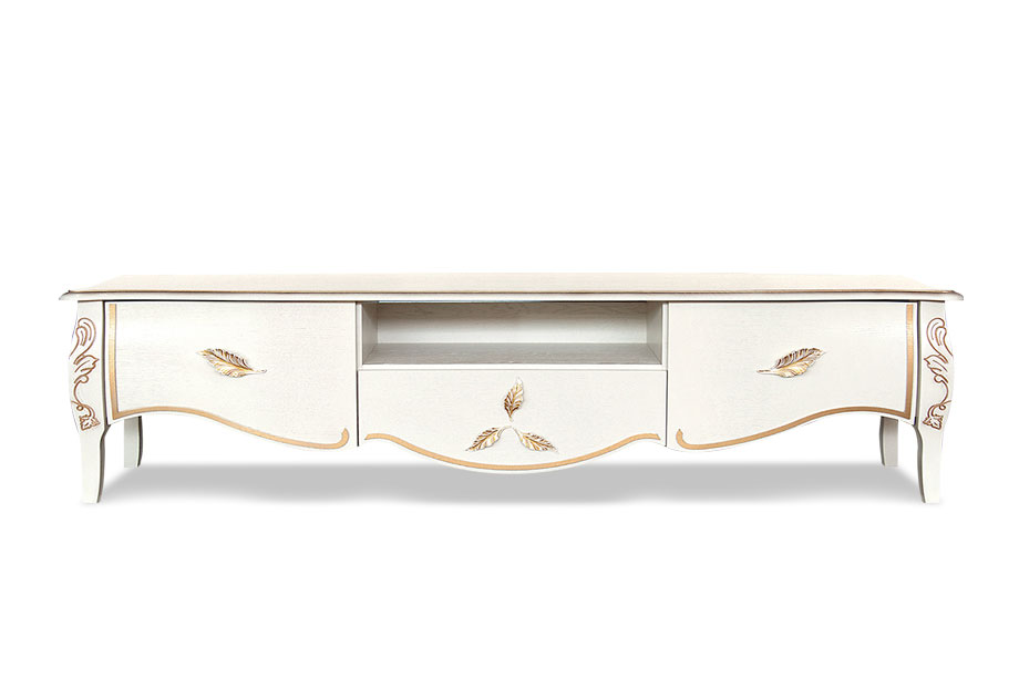 Изготовленная из массива и шпона дуба тумба под ТВ «Трио» 05 в цвете "белая эмаль с золотой патиной" станет украшением Вашей гостиной. Декор в виде резьбы и ручки в виде лепестков превращают эту тумбу в роскошный предмет интерьера. Но красота и привлекательный внешний вид – не единственное, чем она может похвастаться. Выдвижные ящики оснащены качественными доводчиками, что обеспечивает бесшумное закрывание. Удобная высота тумбы позволит Вам с комфортом смотреть любимые фильмы и передачи.