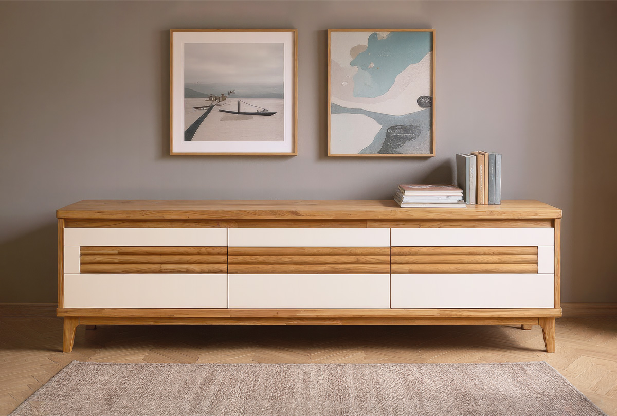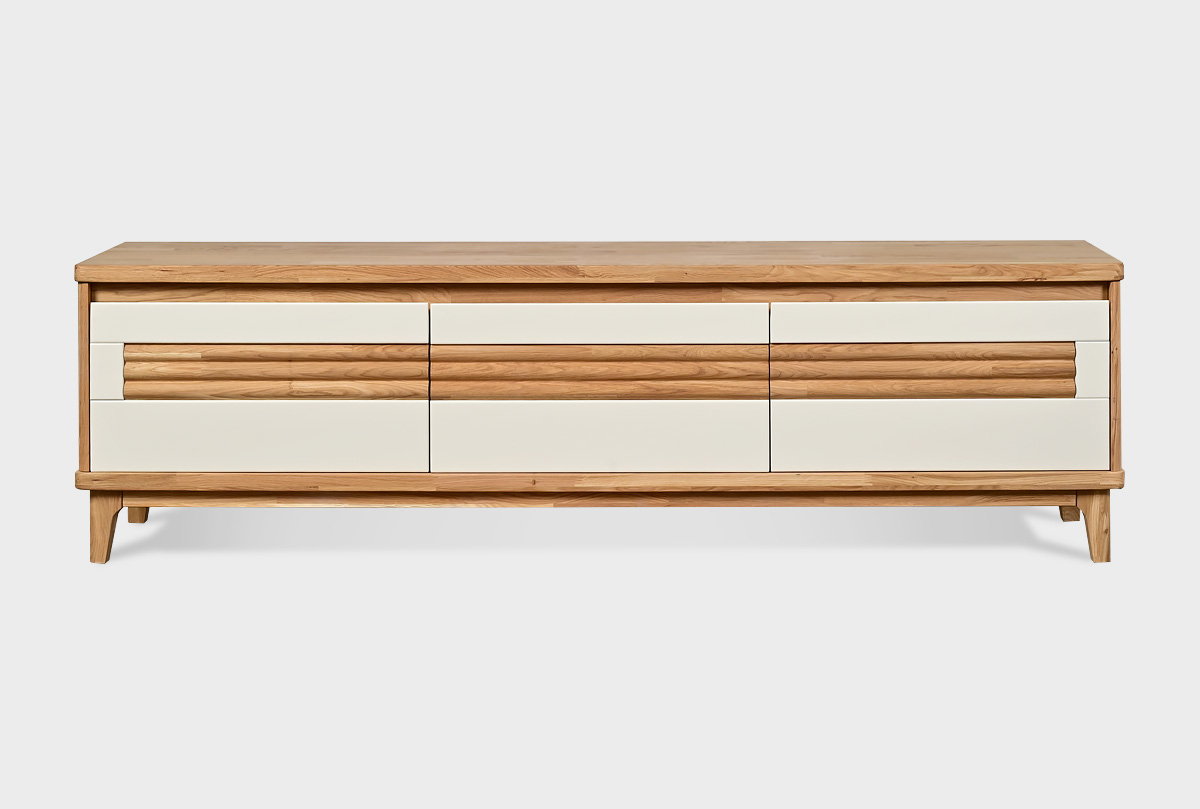 Тумба под телевизор Wallstreet 170 в цвете «к-бейц-масло, ф-белый, вст-бейц-масло» выполнена в современном стиле Лофт с сочетанием текстуры натурального дерева и акцентных вставок. Светлый оттенок изделия придаст помещению атмосферу упорядоченности и спокойствия. Длинная тумба ТВ идеально подходит для гостиной и спальни.