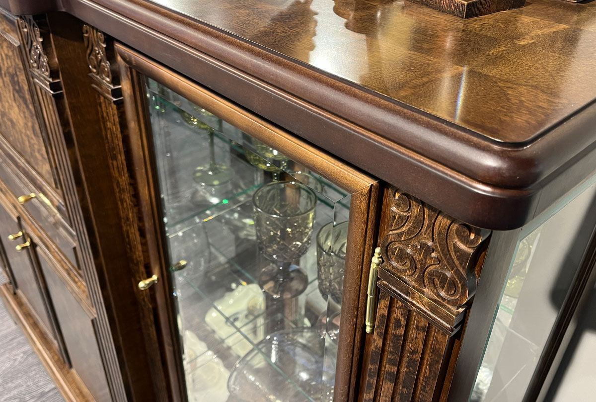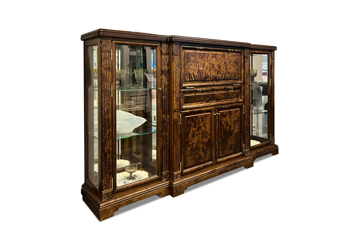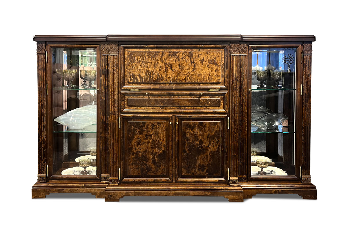 Классический дизайн, в котором представлена тумба из коллекции «Престиж», никогда не устаревает. Сделанная из натурального массива берёзы тумба внесет в любой интерьер нотку стабильности и уюта. Привлекают ее строгие линии и минимум декора в виде классических резных элементов. В выдвинутой вперед центральной части выделяются секретер-бар с откидной крышкой, полки, скрытые за распашными дверцами, и выдвижной ящик. Тумба высокая, но при этом не занимает много места, а множество отделений делает ее достаточно вместительной.