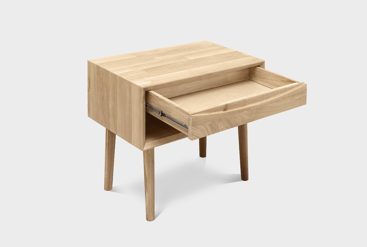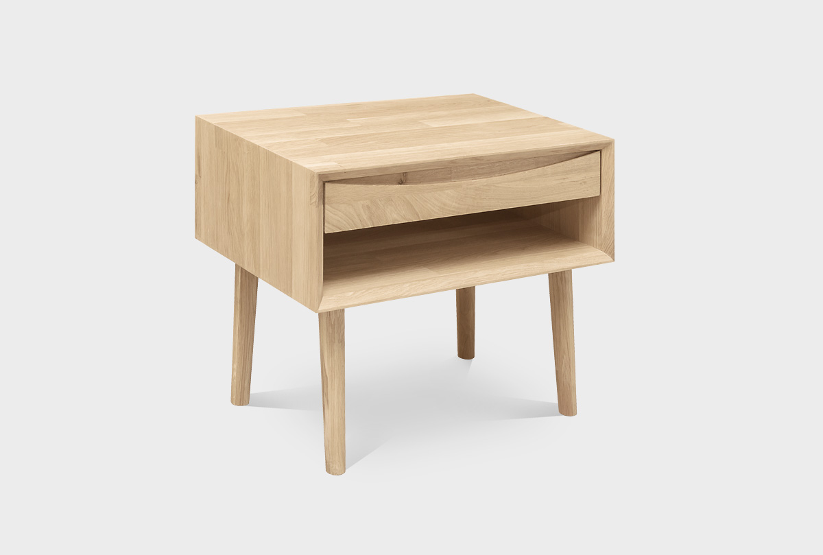 Тумба прикроватная «Ирвинг» (с нишей) — воплощение утончённости и практичности в духе Mid-century modern. Тумба визуально лёгкая, с тонкими, изящно сужающимися ножками и минималистичным корпусом. Лаконичный дизайн без лишних деталей подчёркивает натуральную текстуру дуба.