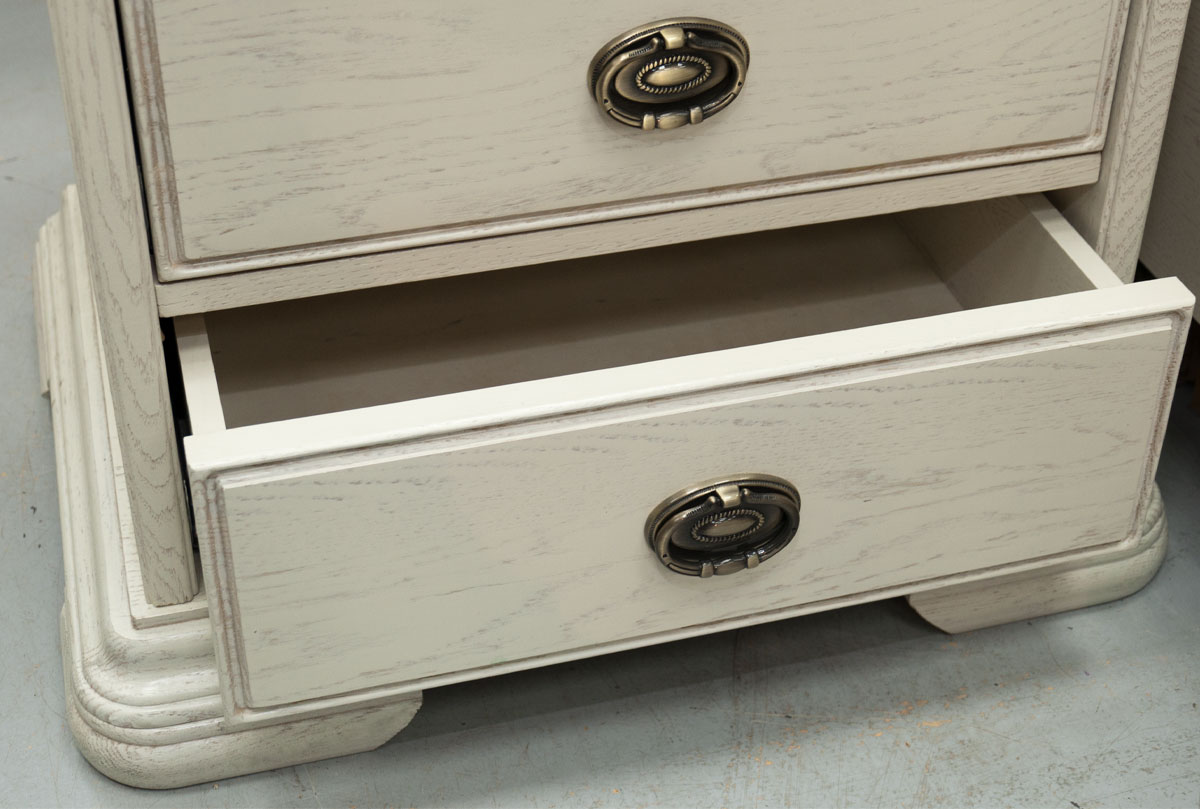 Компактные размеры прикроватной тумбы из коллекции «Лика» (Lika) в цвете «белая эмаль» позволяют разместить ее даже в небольшом пространстве. Тумба может похвастаться оригинальной открытой полочкой и выдвижными ящиками, оснащенными качественной фурнитурой. Благодаря прикроватной тумбе «Лика» из массива и шпона дуба, классический интерьер вашей спальни будет выглядеть более практично и функционально.