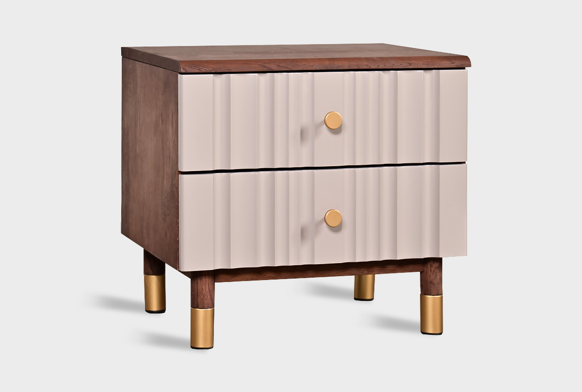 Прикроватная тумбочка «Меридиан» с двумя ящиками изготовлена из дуба. Корпус выполнен в цвете «шоколадный дуб», а фасад — в цвете «нирвана».