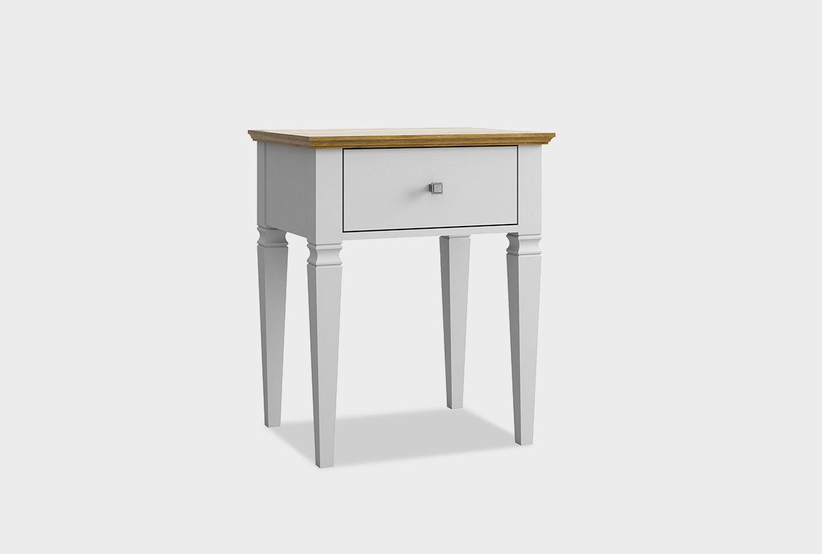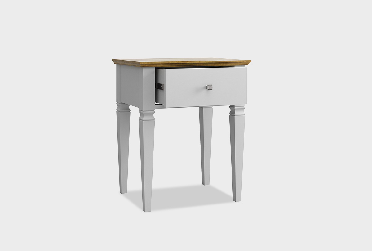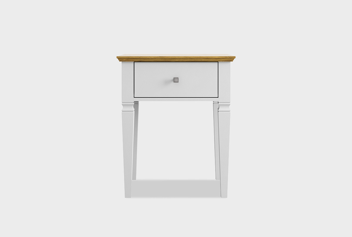 Тумба прикроватная «Ольса-С» 01 в цвете «белый лак+антик 24» выполнена из благородного массива сосны. Красота тумбы в её искренней простоте и природном очаровании. Это не броская роскошь, а тёплая, дышащая эстетика натурального дерева. Мягкие переливы сосновой текстуры, проявленные матовым покрытием, создают умиротворяющий и тактильно приятный образ. Оснащена одним выдвижным ящиком и удобной поверхностью для ночника.