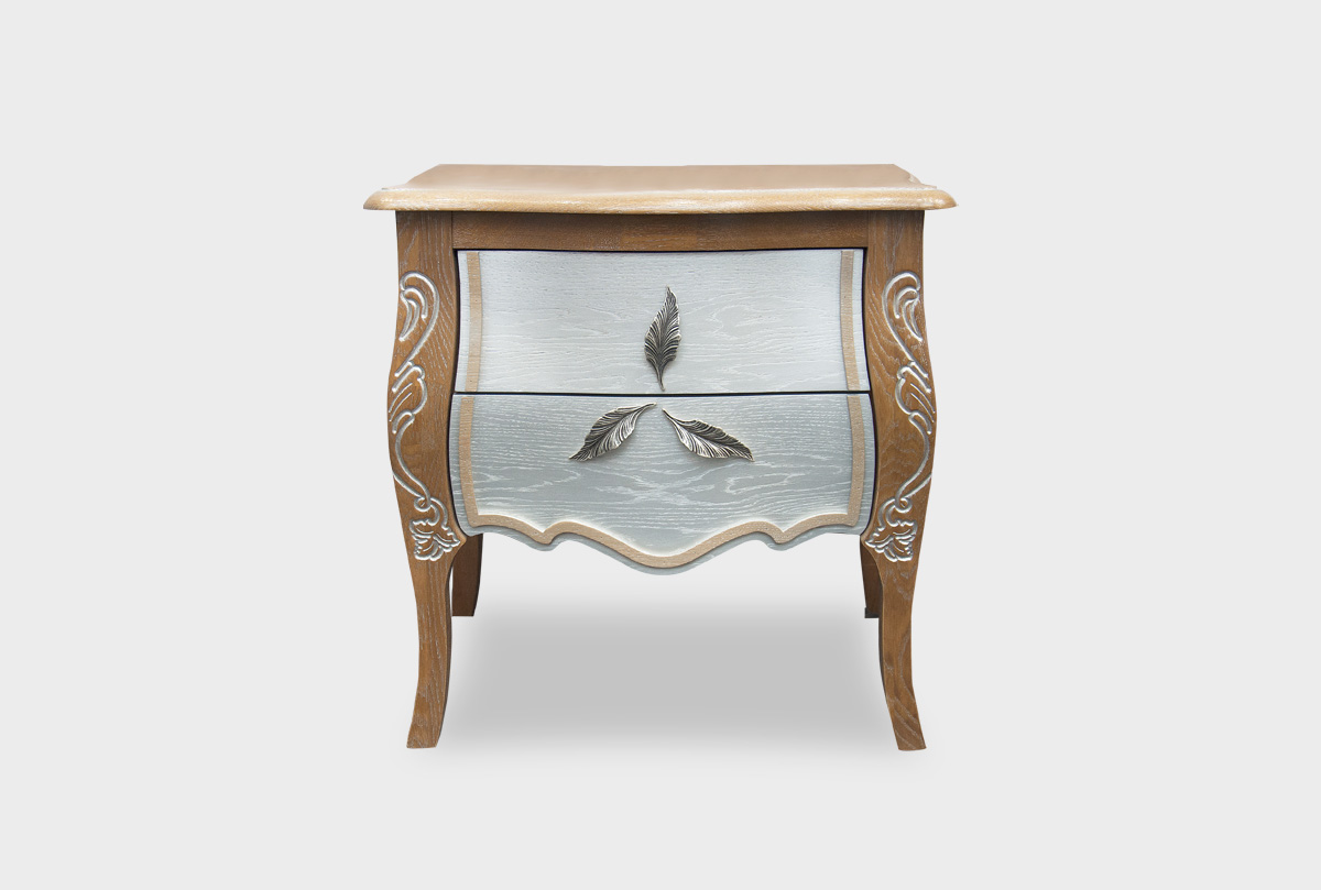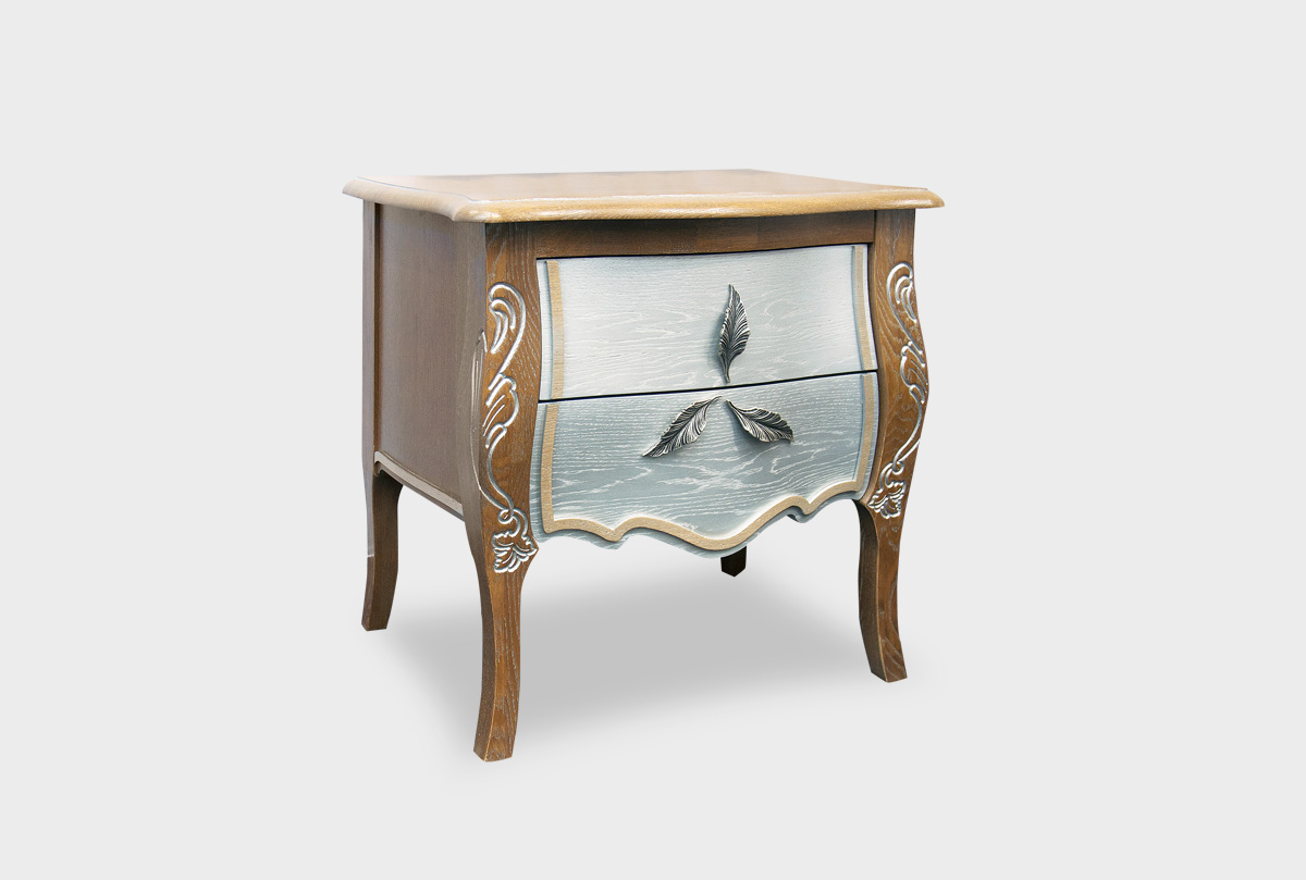 Все мы знаем, как важно окружать себя красивыми вещами. Особенно это касается нашего дома, ведь там мы проводим большую часть своей жизни. Прикроватная тумба из коллекции «Трио» в цвете «коньяк с серебряной патиной+серебро» украсит Вашу спальню и создаст в ней хорошее настроение. Объемные 3D-фасады, декоративная резьба и фурнитура в виде лепестков делают эту тумбу Trio маленьким произведением искусства. В выдвижные ящики, дно которых отделано велюром, поместятся Ваши личные вещи, а удобная высота тумбы позволит разместить на ней светильник, книги или журналы.