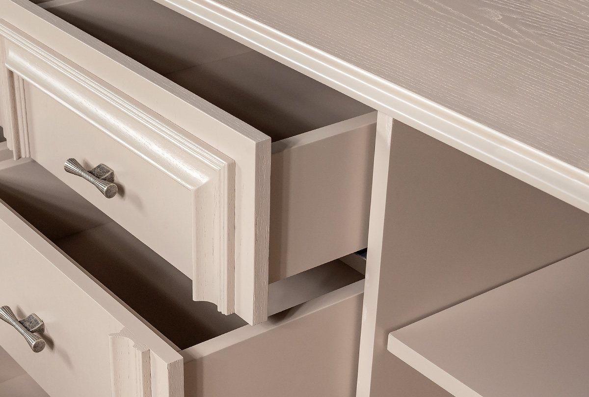 ✅ По центру расположены три вместительных выдвижных ящика с направляющими скрытого монтажа с доводчиками (Европейского пр-ва) , которые подойдут для хранения документов или аксессуаров.