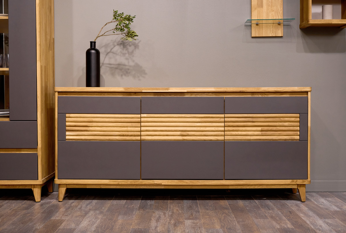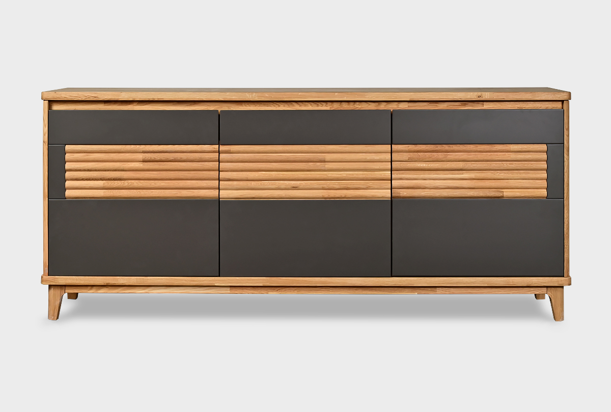 Трехдверная тумба Уоллстрит 3 в цвете «к-бейц-масло, ф-антрацит, вст-бейц-масло» выполнена в современном стиле Лофт с сочетанием текстуры натурального дерева и акцентных вставок. Светлый оттенок изделия придаст помещению атмосферу упорядоченности и спокойствия. Высокая тумба идеально подходит для гостиной и спальни.