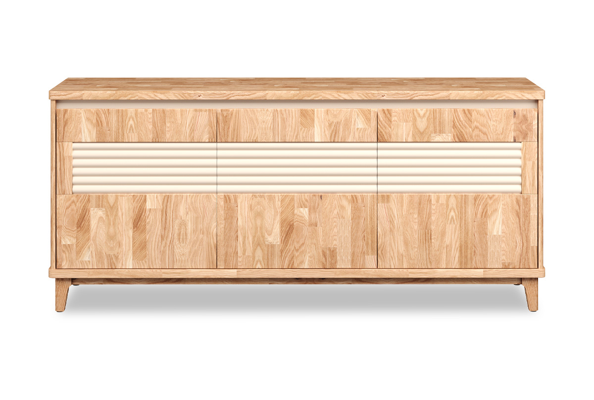 Трехдверная тумба Уоллстрит 3 в цвете «к-бейц-масло, ф-бейц-масло, вст-нюд» выполнена в современном стиле Лофт с сочетанием текстуры натурального дерева и акцентных вставок. Светлый оттенок изделия придаст помещению атмосферу упорядоченности и спокойствия. Высокая тумба идеально подходит для гостиной и спальни.