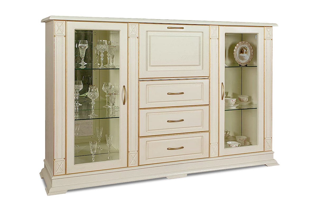 Тумба «Верди Люкс 3/2з» привлекает своей роскошью и изяществом. Несмотря на свои размеры, изделие отличается утонченностью благодаря декоративной резьбе на пилястрах. Стеклянные полки в сочетании со стеклами в боковых секциях создают красивую игру света. На них Вы можете поставить хрустальные бокалы или фамильный сервиз. Три выдвижных ящика и секретер-бар с откидной крышкой придают тумбе основательность и функциональность, а фигурный цоколь подчеркивает изысканность, свойственную классическому стилю.
