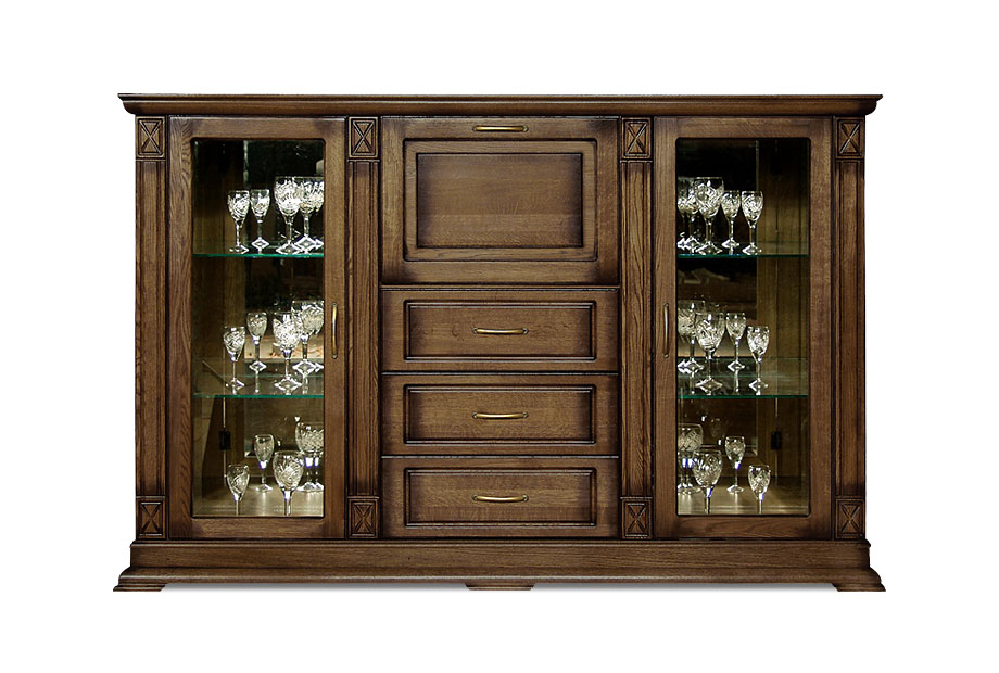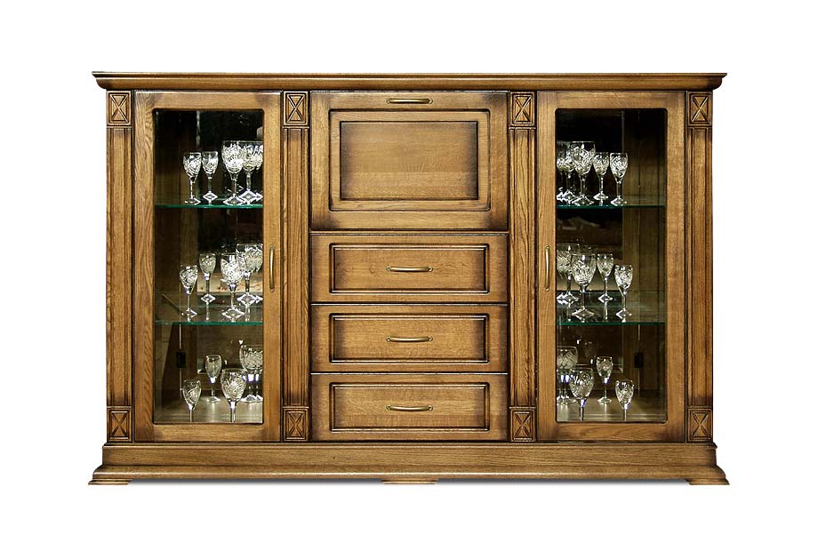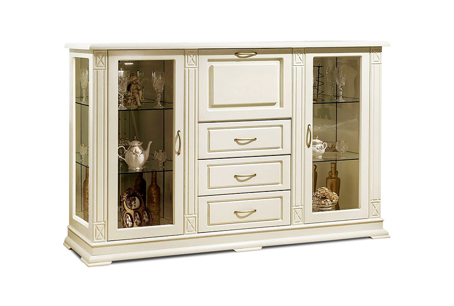 Тумба с барной секцией из коллекции «Верди Люкс» привлекает своей роскошью и изяществом. Несмотря на свои размеры, изделие отличается утонченностью благодаря декоративной резьбе на пилястрах. Стеклянные полки в сочетании со стеклами в боковых секциях создают красивую игру света. На них Вы можете поставить хрустальные бокалы или фамильный сервиз. Три выдвижных ящика и секретер-бар с откидной крышкой придают тумбе основательность и функциональность, а фигурный цоколь подчеркивает изысканность, свойственную классическому стилю.