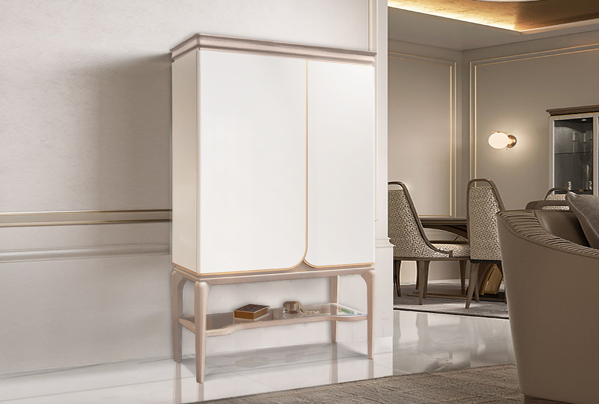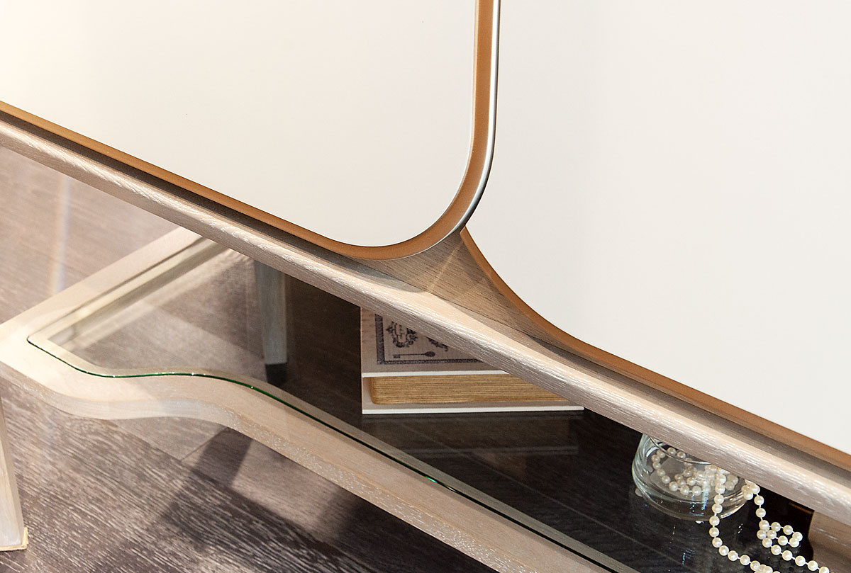 Выполненная в неоклассическом стиле высокая тумба «Алекса» в цвете "айвори+жемчужный дуб" займет центральное место в любой гостиной. Удлиненные изящные ножки, гладкие фасады цвета «айвори» в сочетании с текстурой натурального дуба и золотой окантовкой, которая изумительно расставляет акценты, – всё это превращает высокую тумбу в уникальный предмет интерьера. Открытая стеклянная полка и светодиодная подсветка делают тумбу еще более легкой и воздушной.