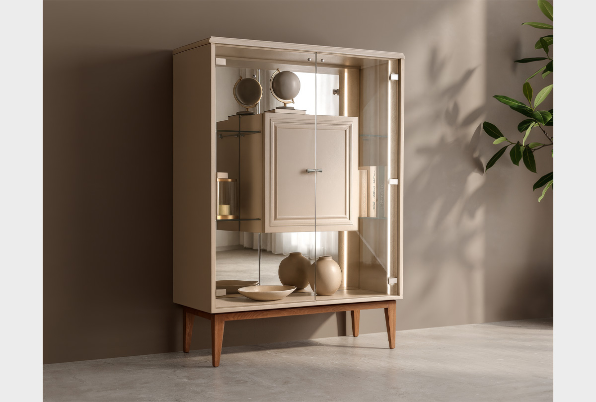 ✅ За двумя распашными дверцами расположены стеклянные полки.