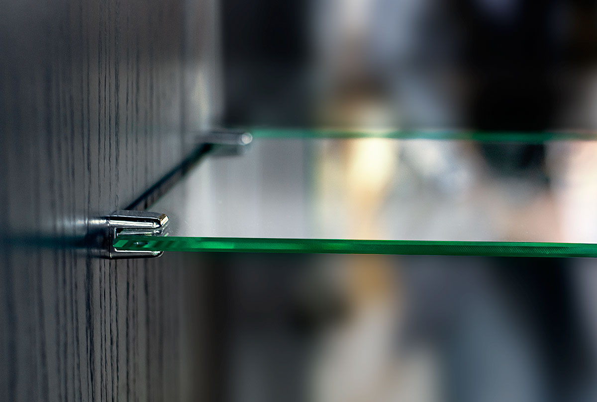 ✅ За двумя распашными дверцами расположены стеклянные полки.