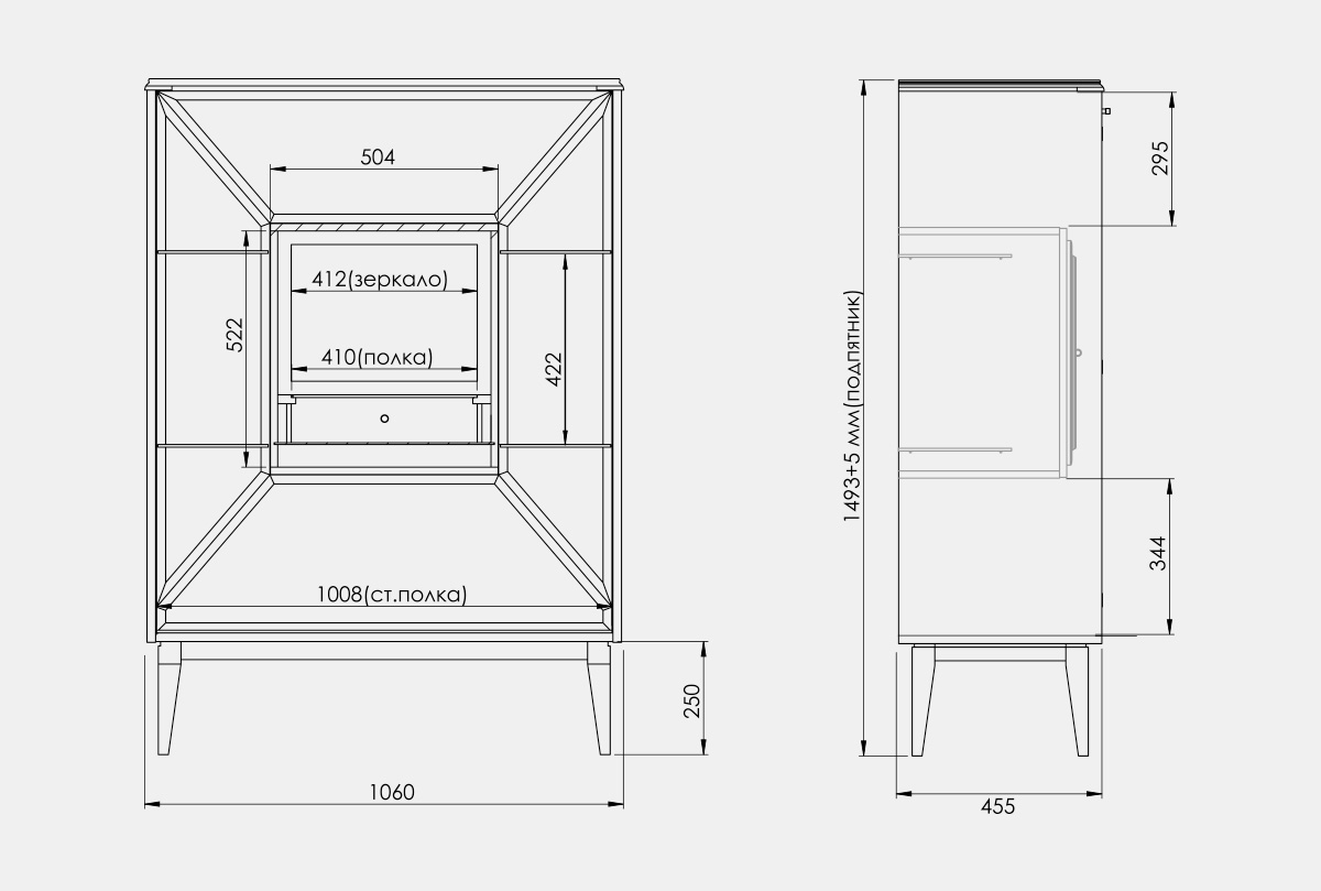 ✅ Размеры тумбы: ширина — 1060 мм, высота — 1500 мм, глубина — 455 мм.