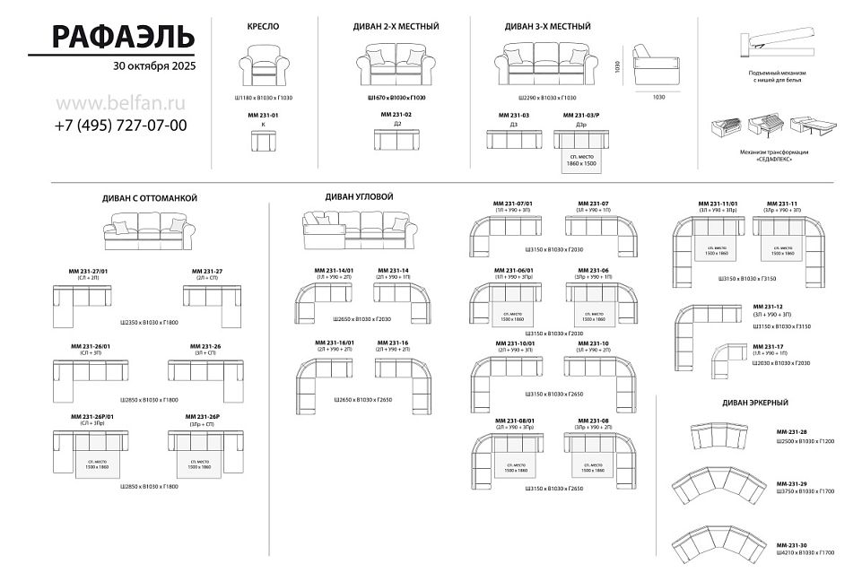 ✅ Диван «Рафаэль» может изготавливаться под заказ в определенных тканях. Стоимость дивана зависит от группы выбранной ткани и наличия механизма трансформации спального места.