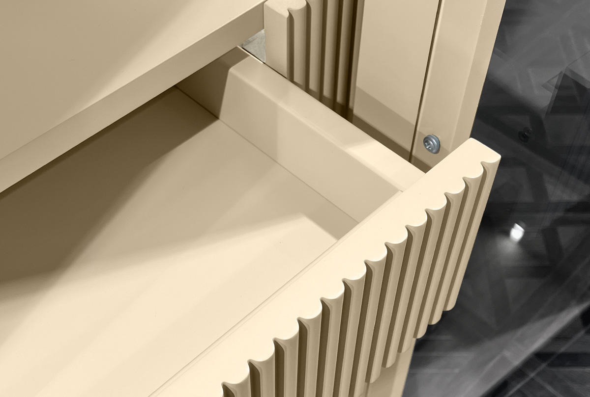 ✅ Объёмная скругленная фрезеровка на фасадах в сочетании с гладкой поверхностью, подчеркнутая изящным металлическим декором, словно вектором – все это создает неповторимый уникальный дизайн каждого предмета коллекции.