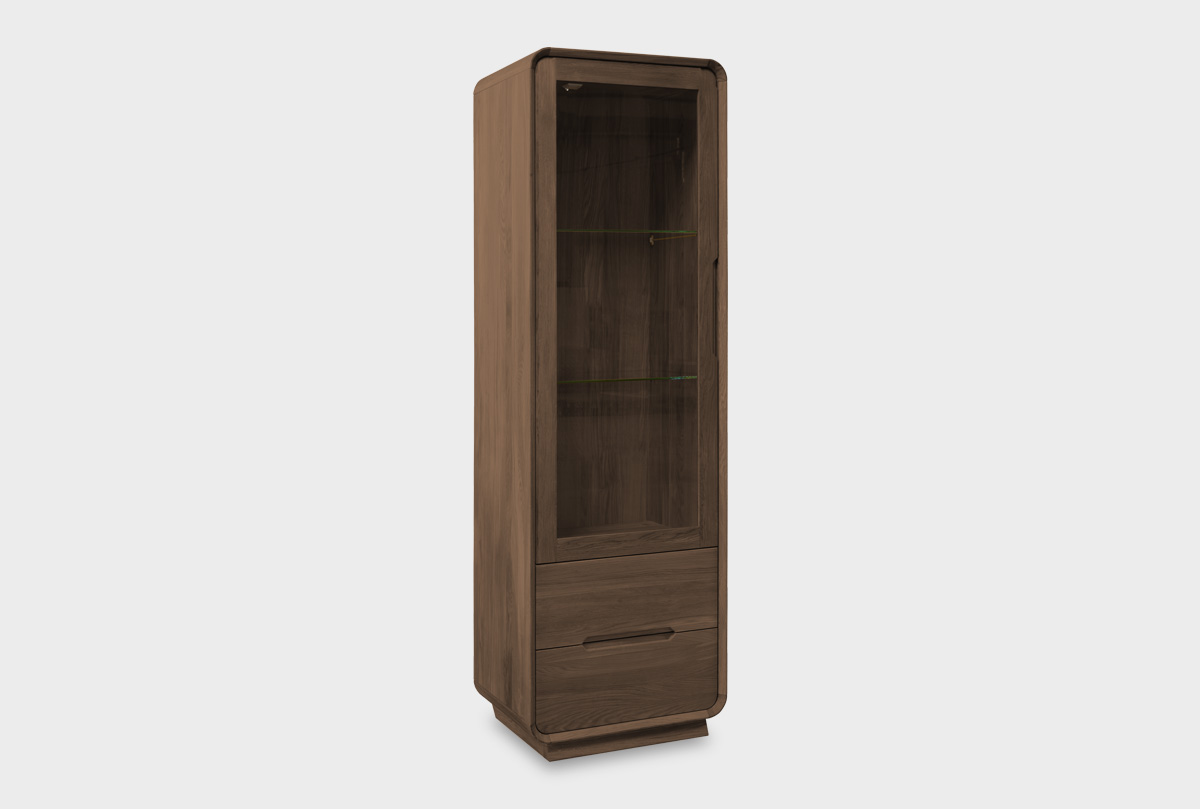 Витрина «Монблан» с левой распашной дверцей в цвете «графит» — утончённое и практичное решение для хранения и демонстрации любимых предметов. За стеклянной дверцей расположены две регулируемые по высоте стеклянные полки — чтобы красиво расставить книги, декор или посуду. В нижней части — два вместительных выдвижных ящика глубиной 385 мм, идеально подходящих для текстиля, бумаг и других вещей, которые хочется держать под рукой, но вне поля зрения.