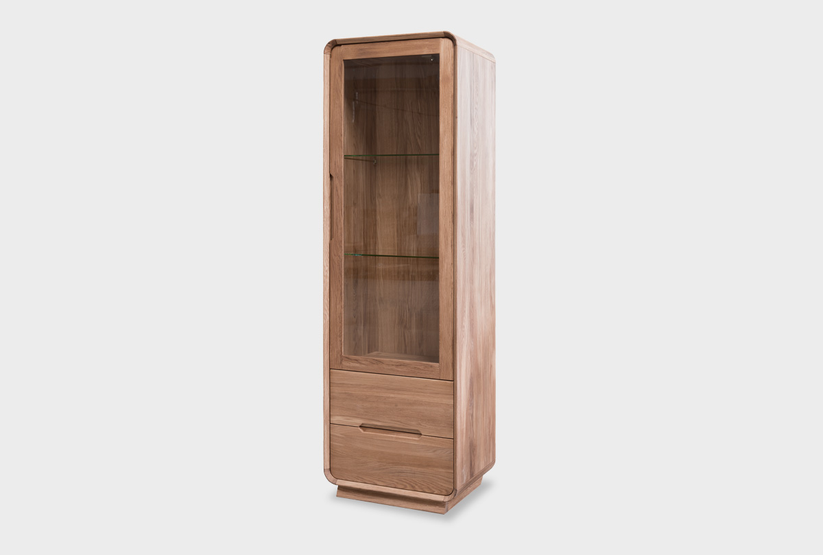 Витрина «Монблан» с правой распашной дверцей — это изящный акцент в любом пространстве. Прозрачная стеклянная дверь позволяет деликатно продемонстрировать любимую посуду, декор или книги. Две стеклянные полки внутри регулируются по высоте, адаптируясь под ваши потребности и сохраняя ощущение лёгкости благодаря прозрачности. В нижней части витрины — два вместительных выдвижных ящика глубиной 385 мм для хранения вещей, которые хочется держать под рукой, но скрыть от глаз.