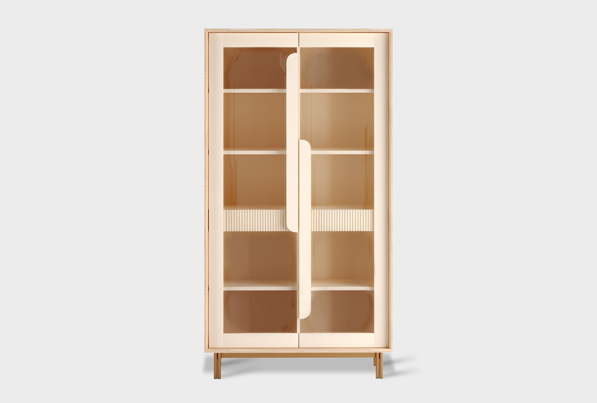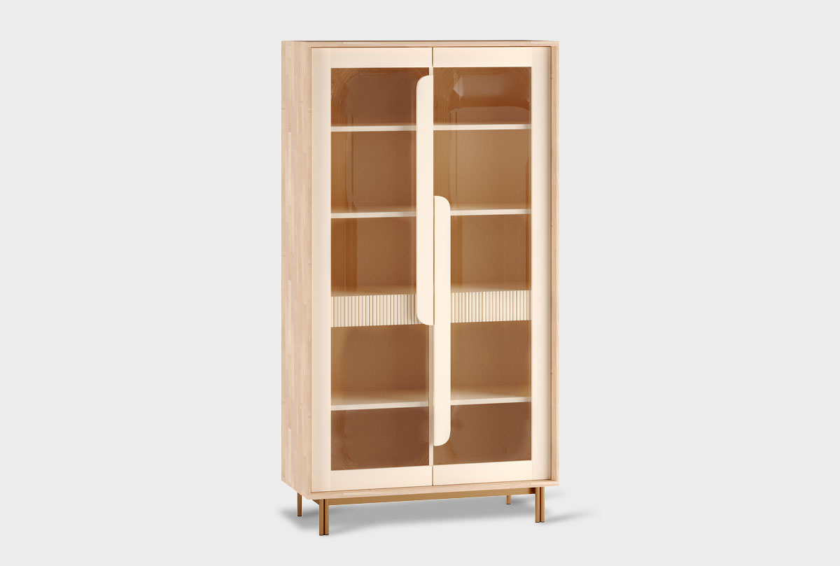 Витрина «Avenue» с двумя дверцами в цвете "персиковое масло, нюд"— это элегантная модель, выполненная из шпона дуба. Она имеет строгие, лаконичные формы, но при этом её конструкция достаточно сложна и включает в себя выступающие элементы. В витрине также предусмотрены выдвижные ящики для удобного хранения и демонстрации товаров.