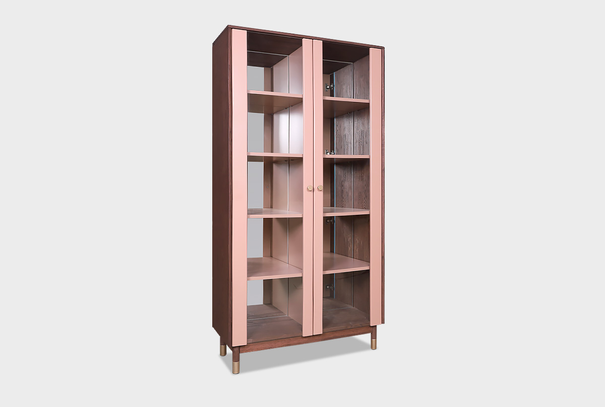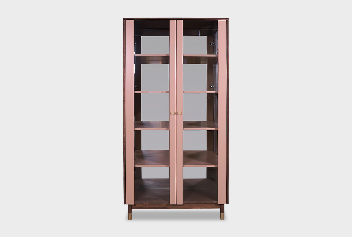 Витрина 2-х дверная «Меридиан» из дуба. Корпус изделия выполнен в цвете «шоколадный дуб», а фасад — в цвете «дымчатая роза».