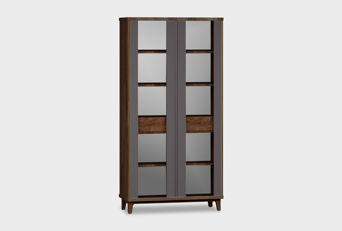 Двухдверная витрина Wallstreet в цвете «к-графит, ф-антрацит, вст-графит» выполнена в современном стиле Лофт с сочетанием текстуры натурального дерева и акцентных вставок. Светлый оттенок изделия придаст помещению атмосферу упорядоченности и спокойствия. Высокий шкаф с витриной отлично подойдет для гостиной или столовой.