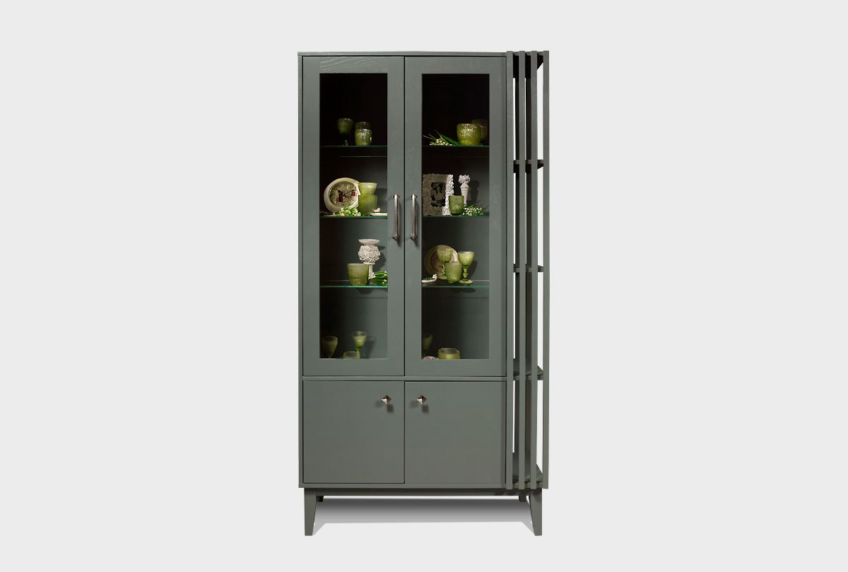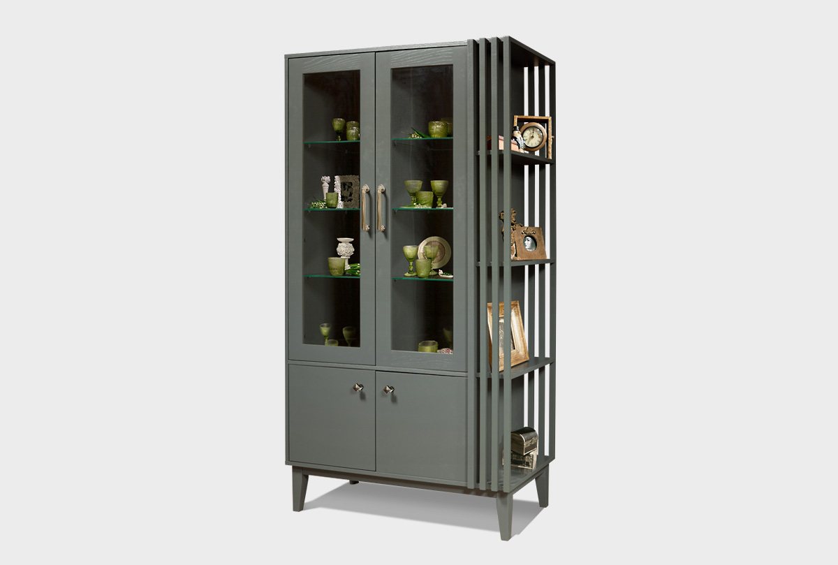 ✅ За двумя стеклянными распашными дверьми расположены 6 съемных полок, за двумя глухими дверьми расположены 2 съемные полки (по одной полке в каждом отделении).