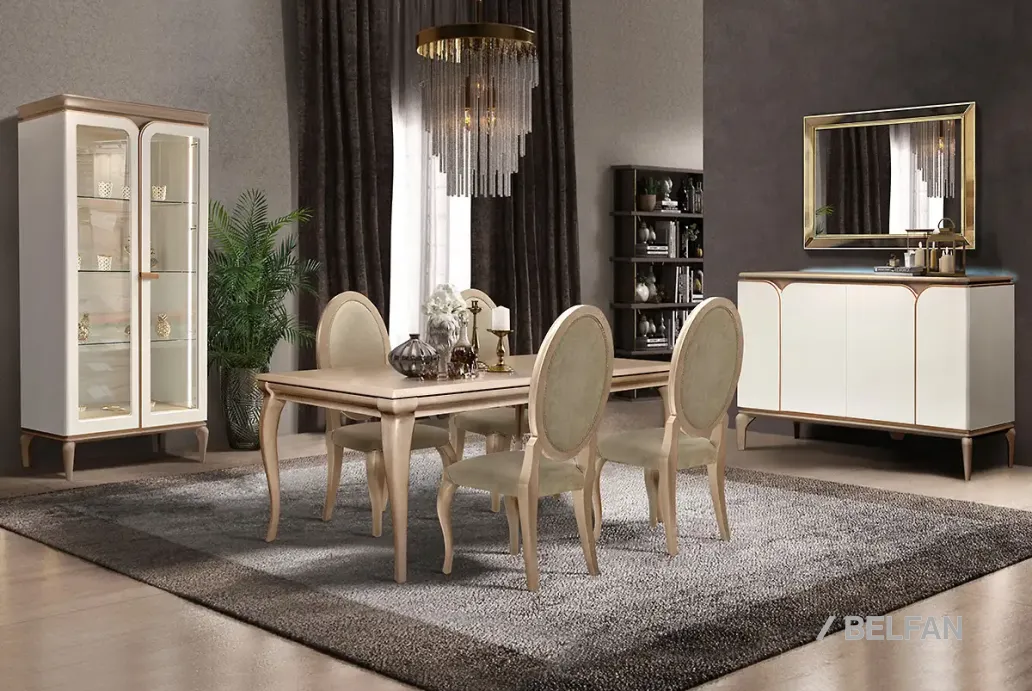 Гостиная «Алекса», вариант интерьера 2. в итальянском стиле. Тумба, шкаф с витриной, обеденный стол.