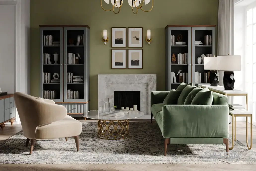 Вариант расстановки мебели «Рандеву» в гостиной #2. Две двухдверные витрины из массива сосны в цвете «серый 7042+антик 24» прекрасно подойдут для создания интерьера гостиной.