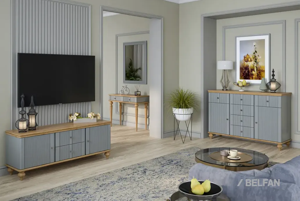 Вариант расстановки мебели «Рандеву» в гостиной #2. Тумба под телевизор, консоль и тумба из массива сосны в цвете «серый 7042+антик 24» прекрасно подойдут для создания интерьера гостиной.