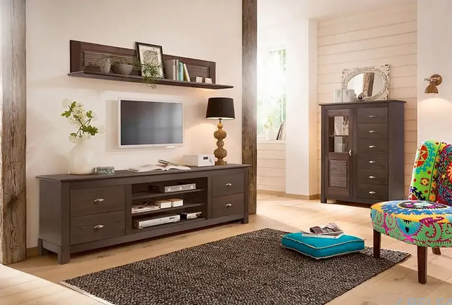 Вариант расстановки мебели "Рауна" в гостиной #1. Тумба под ТВ, полка настенная и комод из массива сосны прекрасно подойдут как для создания интерьера гостиной не только в стиле Прованс, но и Кантри.