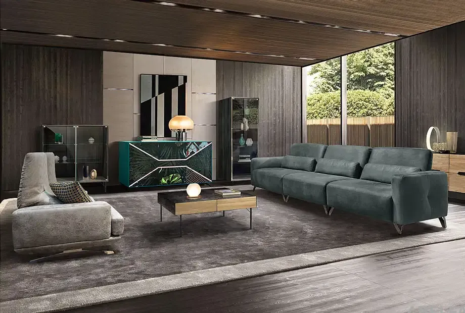 Модный и функциональный диван «Капристо» в интерьере гостиной в стиле Лофт уютного и современного дизайна.