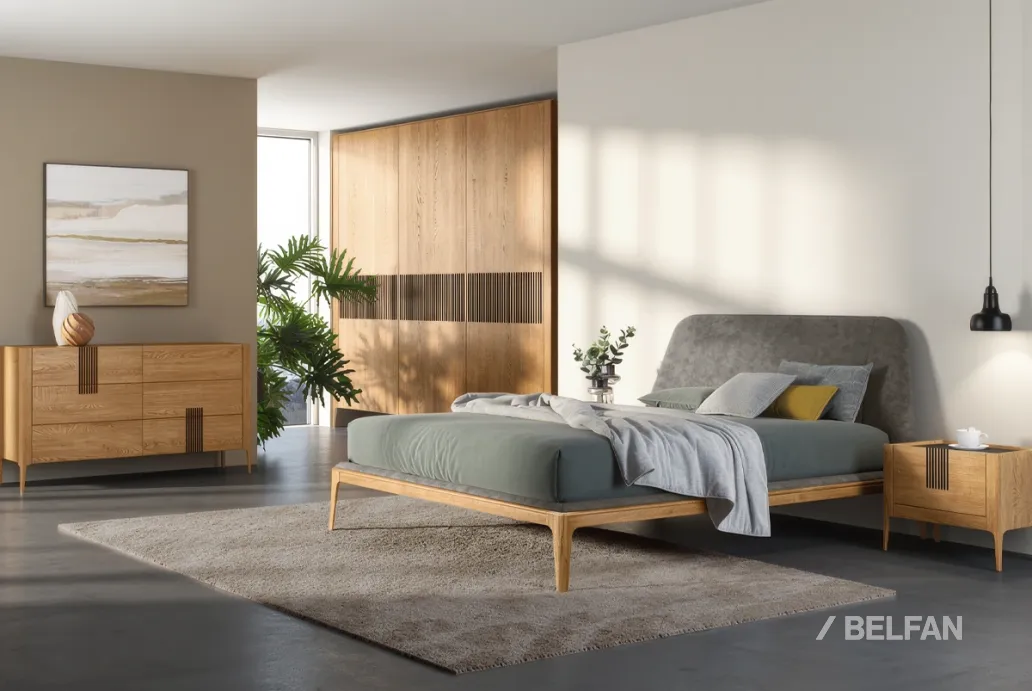Дизайнерская мебель для спальни «Бергамо» № 3 поможет вам создать современный и яркий интерьер, соответствующий последним трендам. В комплект входят кровать с мягким изголовьем, шкаф, прикроватная тумба и комод.