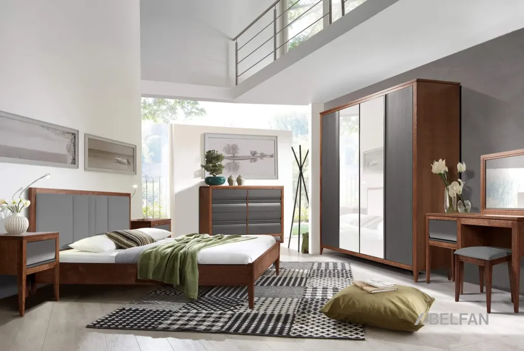 Спальня Dakota, вариант 1 — это превосходный выбор для создания современного интерьера. Её дизайн отличается прямыми строгими формами, высокими утончёнными ножками и акцентными фасадами в глубоком насыщенном оттенке, который идеально сочетается с натуральной текстурой дерева.