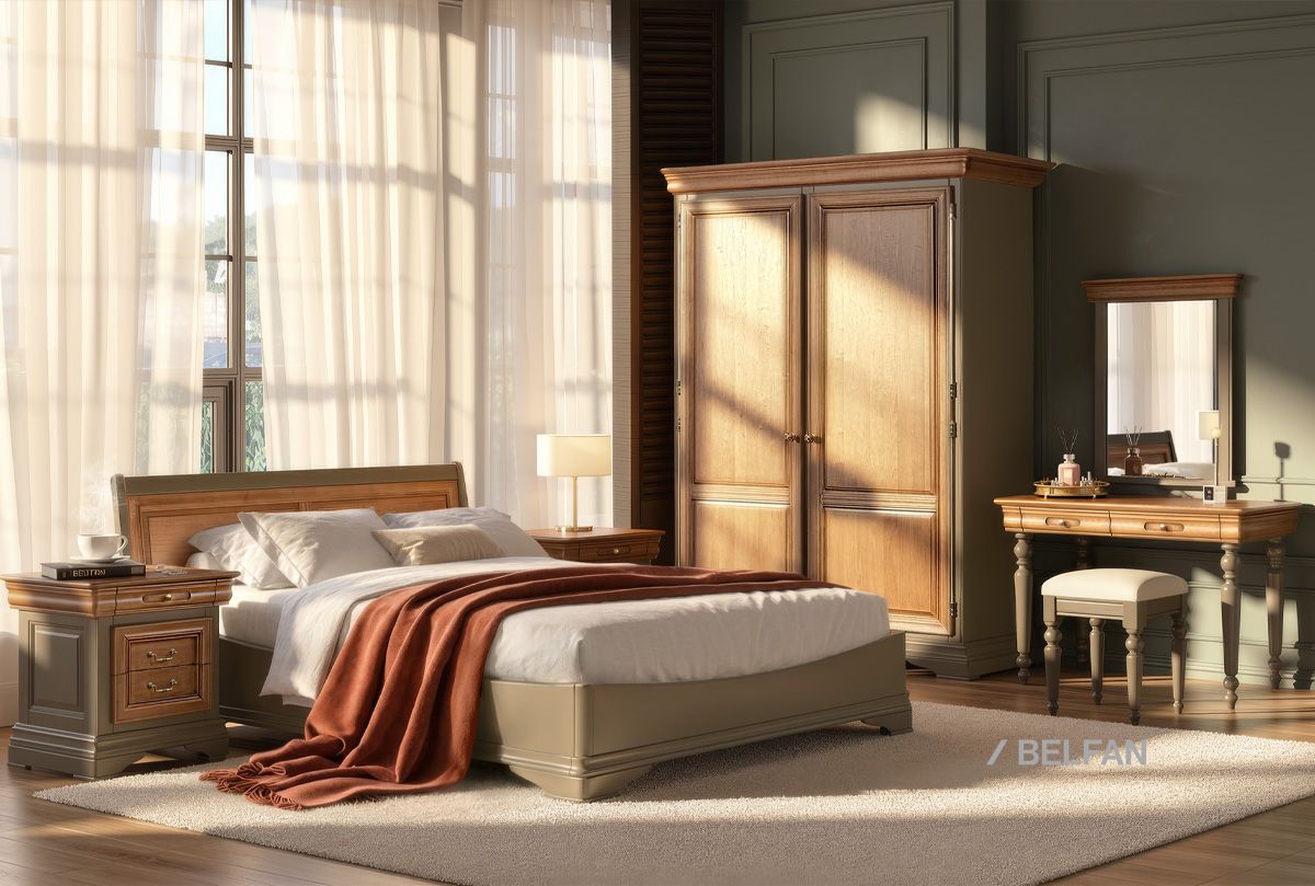 Спальня из коллекции "Оливия". Кровать, прикроватные тубы, Шкаф для одежды, стол туалетный и зеркало из благородного массива и шпона бука.