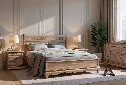 Спальня «Оскар» вариант 8. Укомплектована двуспальной кроватью, прикроватными тумбами, туалетным столиком с банкеткой, шкафом для одежды и сундуком с мягким сиденьем из натуральной кожи.