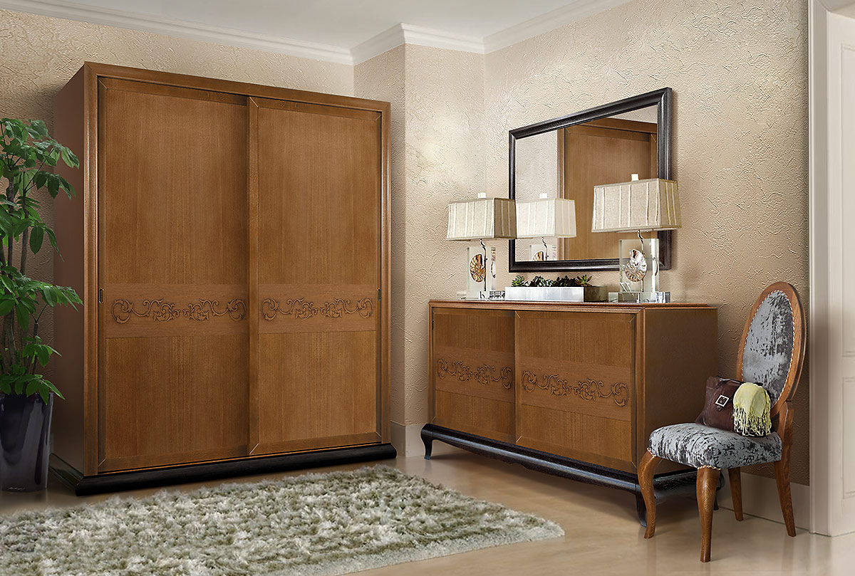 Мебель для спальни и гостиной «Соната» изготовлена из массива и шпона дуба, отличается оригинальным дизайном и сочетанием контрастных оттенков.